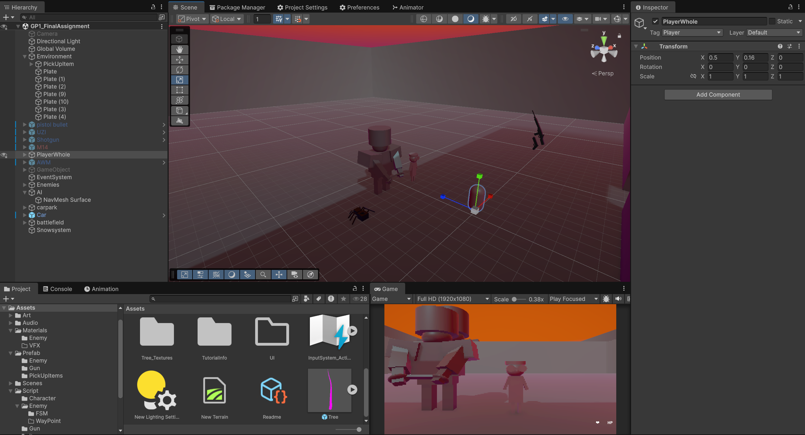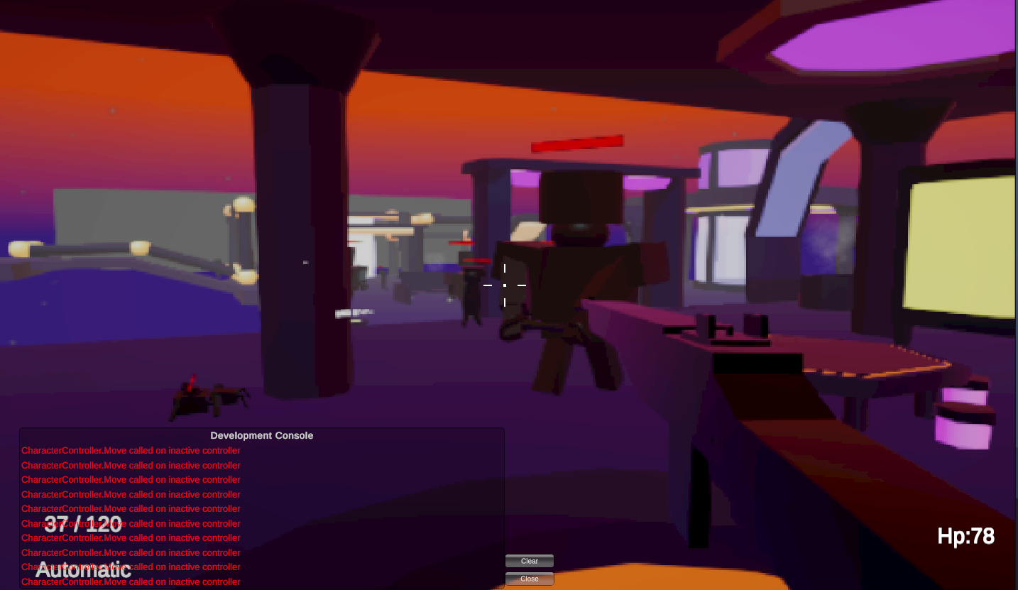 This is a simple shooting game demo, submitted as an assignment for our group's programming class. Game features include character movement, view rotation, running, jumping, crouching, sprinting, picking up weapons, reloading and magazine management, ray detection, target hits, bullet craters, right-click aiming, switching to semi-automatic mode, crosshair, player health updates, monster health updates and display, enemy attacks, death respawn and restart, and restarting upon falling. Furthermore, animations are simulated using code.